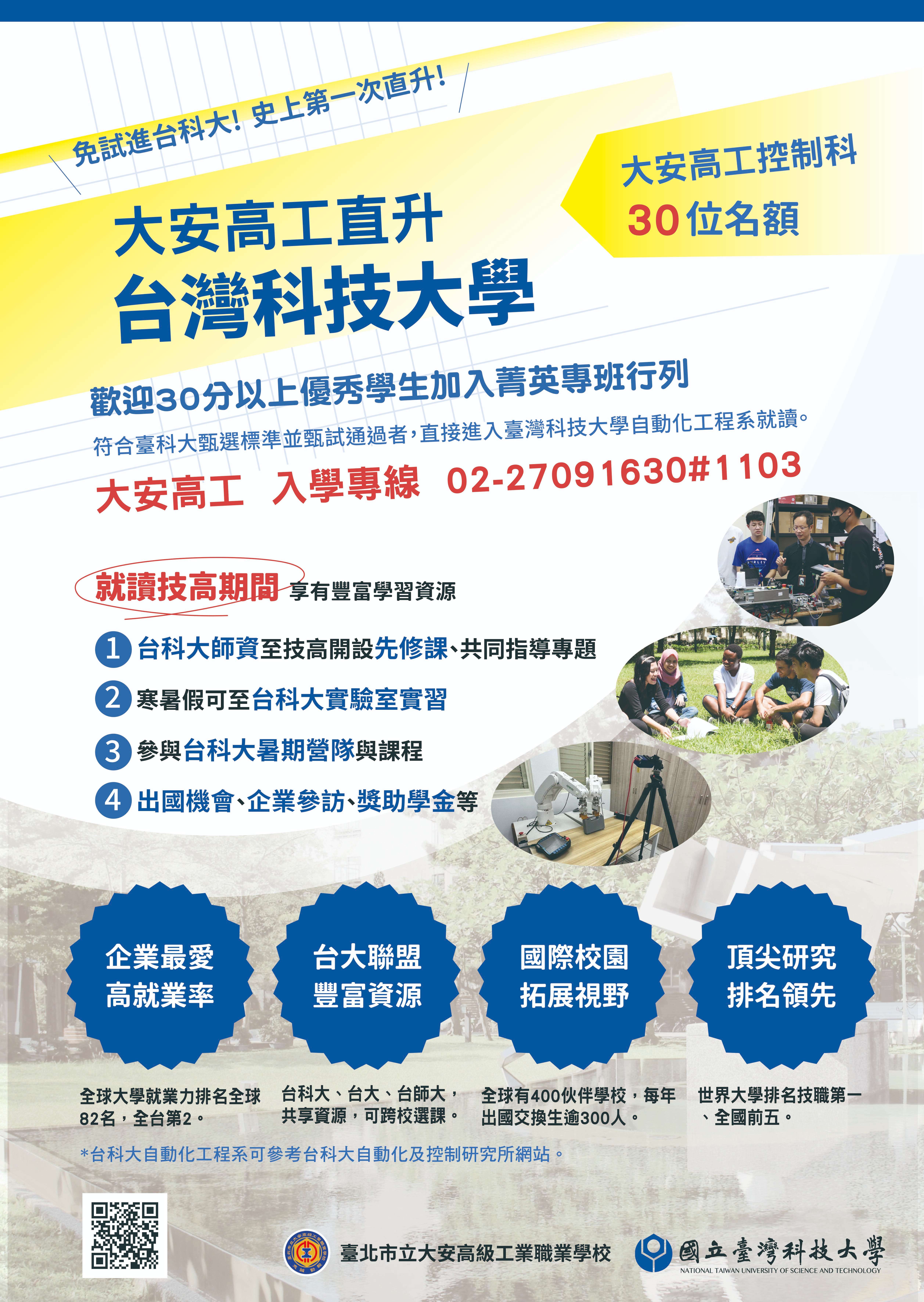 一.台北市大安高工與國立臺灣科技大學合作3+2新五專模式「直 升臺科大專班」,為具實作潛力學生打造直升國立科技大 學的入學管道,鼓勵學