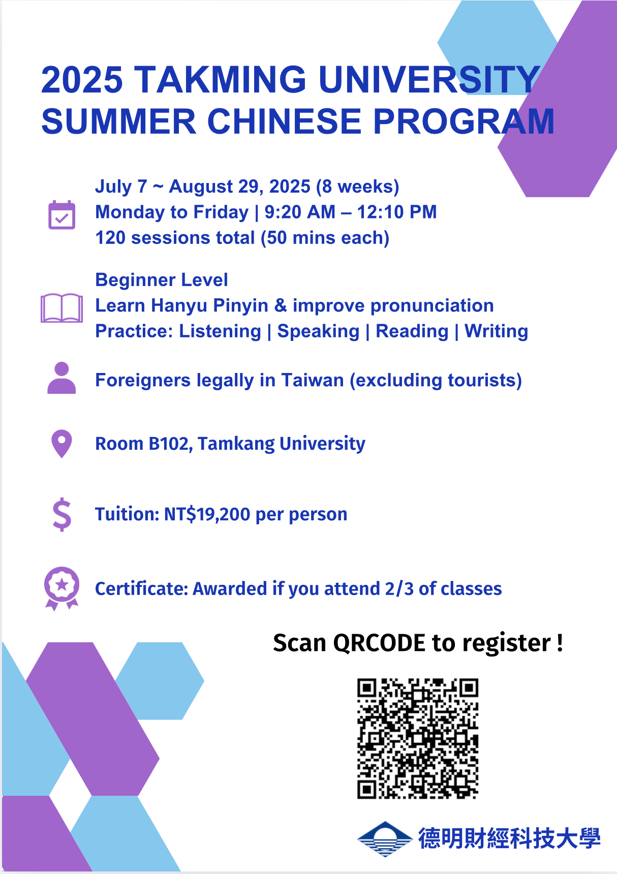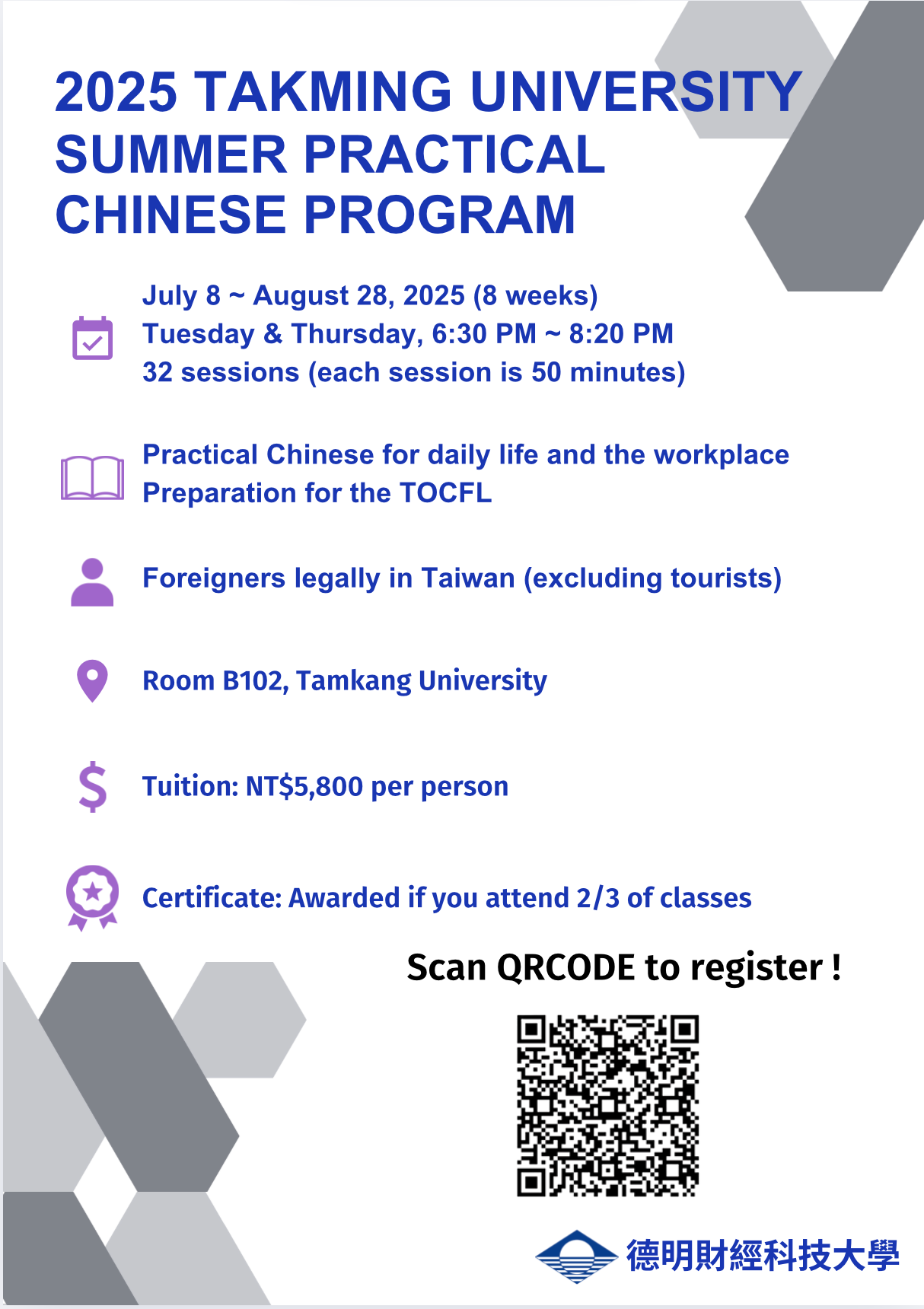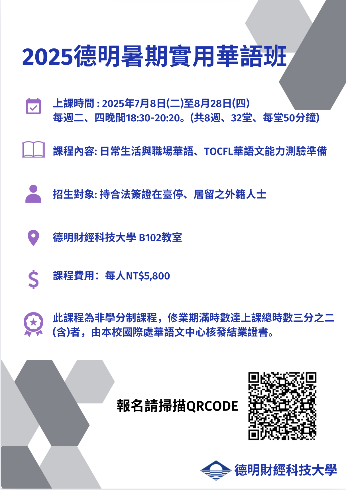 一、為幫助在臺外籍人士適應生活與工作環境,本校特開設 「2025德明科大暑期正規華語班(日間)」及「2025德明 科大暑期實用華語班(夜間)」,提供基礎華語學習。 二、中英文課程文宣如附件,課程資訊如說明三至說明七。 三、上課時間: (一)正規班:2025年7月7日至8月29日,每週一至五上午09: 20-12:10。(共8週、120小時) (二)實用班:2025年7月8日至8月28日,每週二、四晚間18: 30-20:20。(共8週、32小時) 四、課程內容: (一)正規班:準備級,課程內容含漢語拼音、發音糾正、聽說讀寫全方位學習。 (二)實用班:日常生活與職場華語、TOCFL華語文能力測驗準 備。 五、招生對象:持合法簽證在臺停留、居留之外籍人士 六、上課地點:德明財經科技大學B102教室(台北市內湖區環 山路一段56號) 七、課程費用: (一)正規班:NT$19,200 (二)實用班:NT$5,800 八、報名網址: (一)正規班:https://forms.gle/gvoMW6u3EoC5Ek5G9 (二)實用班:https://forms.gle/cRv7jtt91abipUA1A 九、旨揭課程皆非學分制,修業期滿時數達上課總時數三分之 二(含)者,由本校華語文中心發給結業證書。