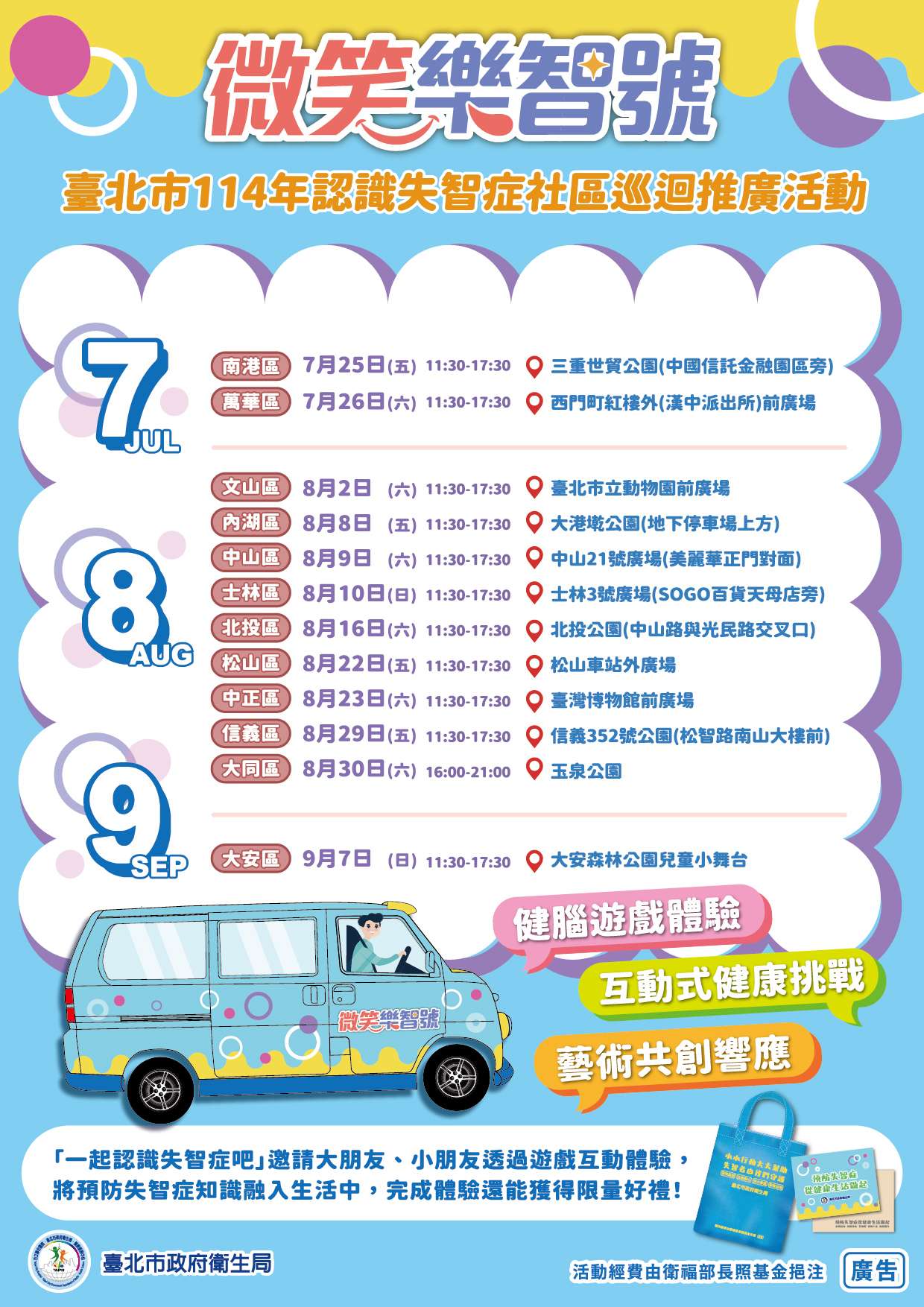 為增加民眾對失智症的認識及預防,臺北市政府衛生局114年結合「微笑 樂智號」胖卡車,規劃「健腦遊戲體驗」、「互動式健康 挑戰」、「藝術共創響應」等多元內容,巡迴本市十二行 政區,藉由趣味互動吸引民眾參與,將失智症知識融入生 活中。
