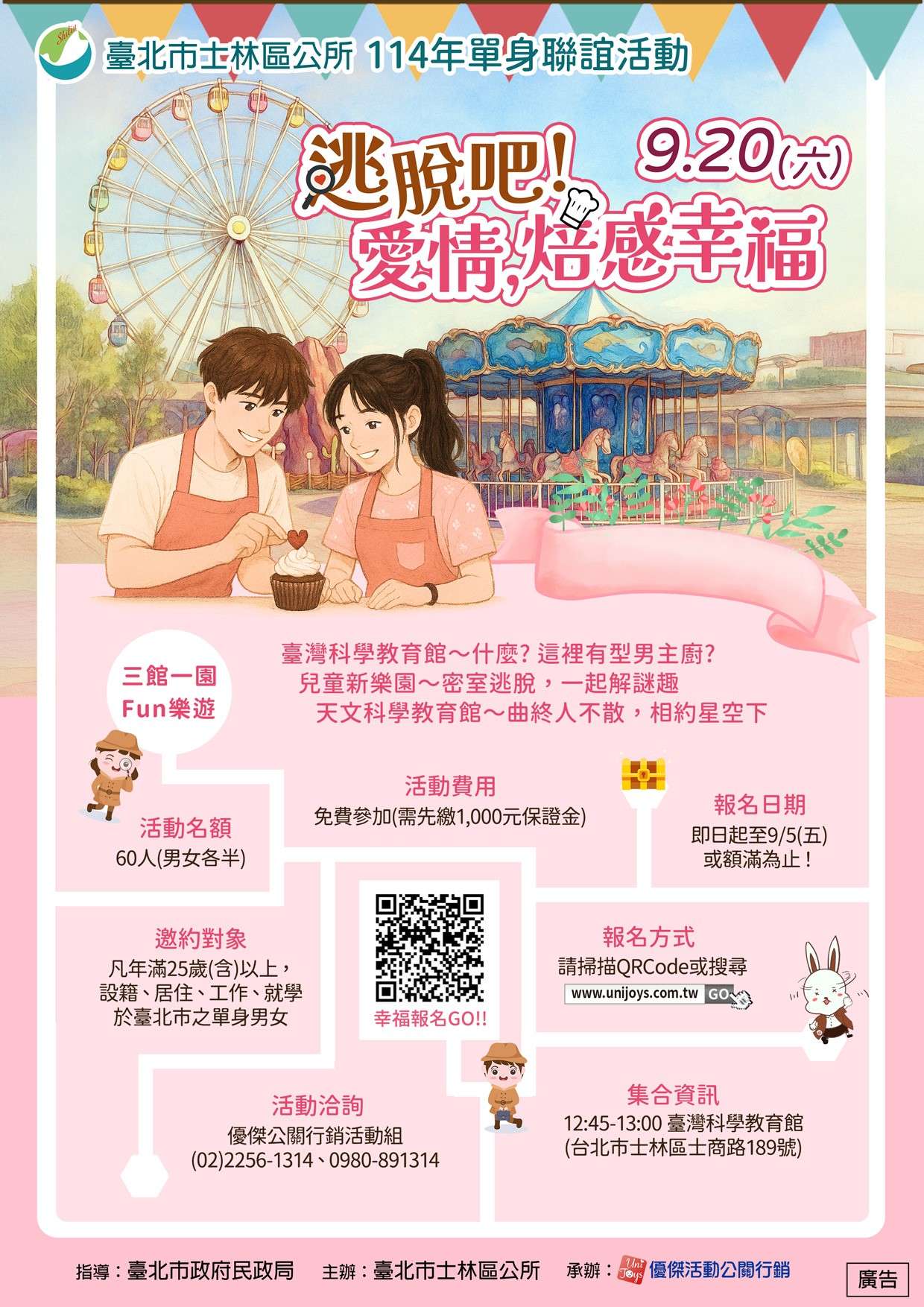 臺 北市士林區公所114年度『逃脫吧!愛情,焙感幸福』聯誼 活動,將於114年9月20日(星期六)12時45分至18時,假 國立臺灣科學教育館及臺北市立兒童新樂園辦理,線上報 名時間自8月18日起至9月5日或額滿為止,凡年滿25歲以 上,在臺北市居住、工作或就學,並且有穩定工作者(以 士林區或未曾參加過本區活動者優先錄取)皆可報名,總計60個名額,男女各30人,免費參加,活動詳情請參閱報 名QRcode或洽詢聯誼專線(02)2256-1314、0980-891- 314。