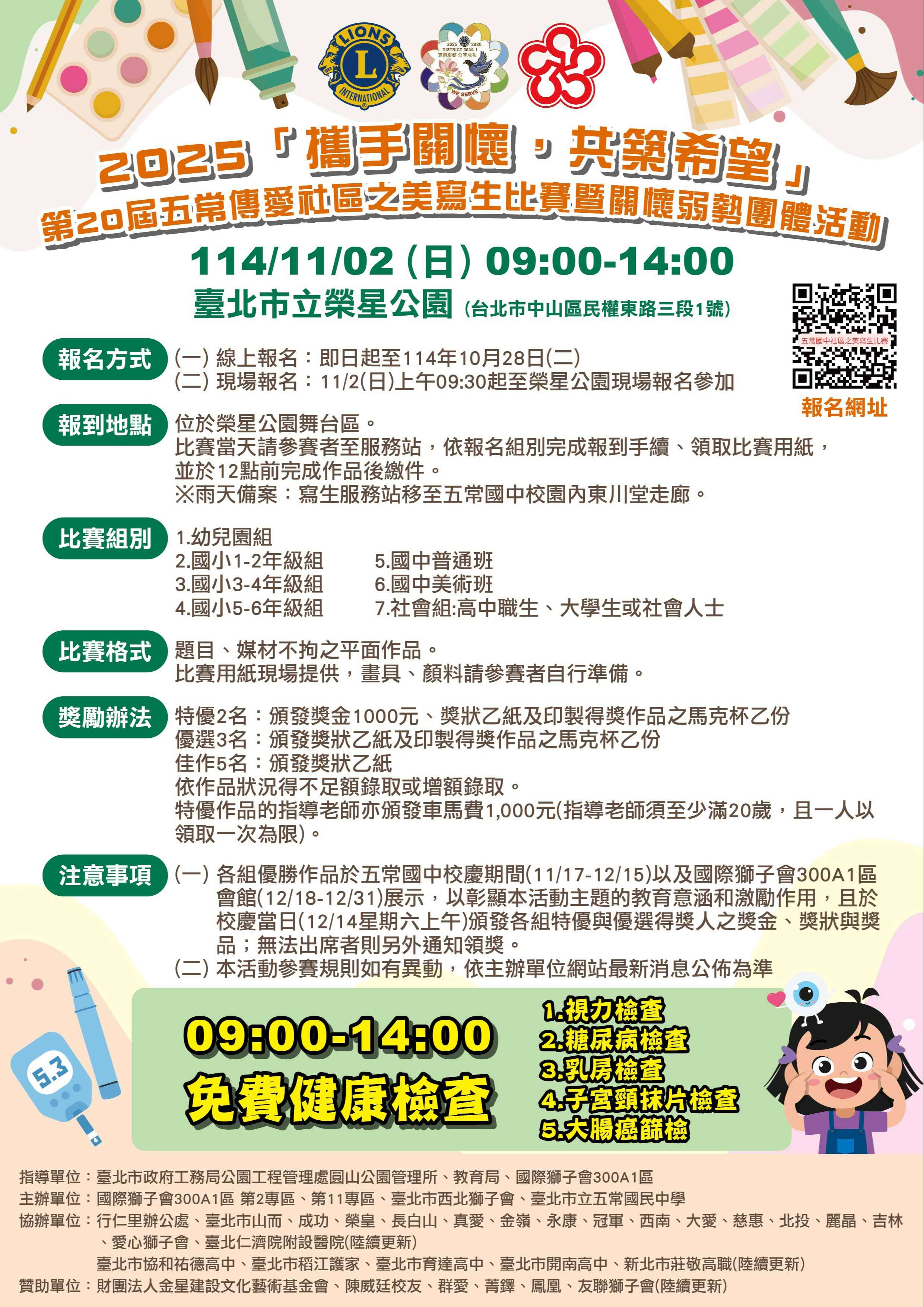 二、比賽地點:榮星公園內(臺北市中山區民權東路三段與龍 江路口),若遇雨天照常舉行,比賽地點移至五常國中校內。 三、線上報名:即日起至114年10月28日(二)止。