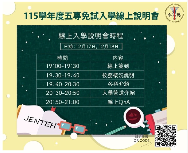 二、本校訂於114年12月17日(星期三)及12月18日(星期四) 晚上19時至21時辦理二場線上入學說明會,除說明五專完 全免試入學、優先免試入學及聯合免試入學之報名須知 外,並邀請本校相關主管線上提供面對面諮詢服務,使學 生更充分掌握入學前後各項重要資訊,歡迎踴躍報名參 加。