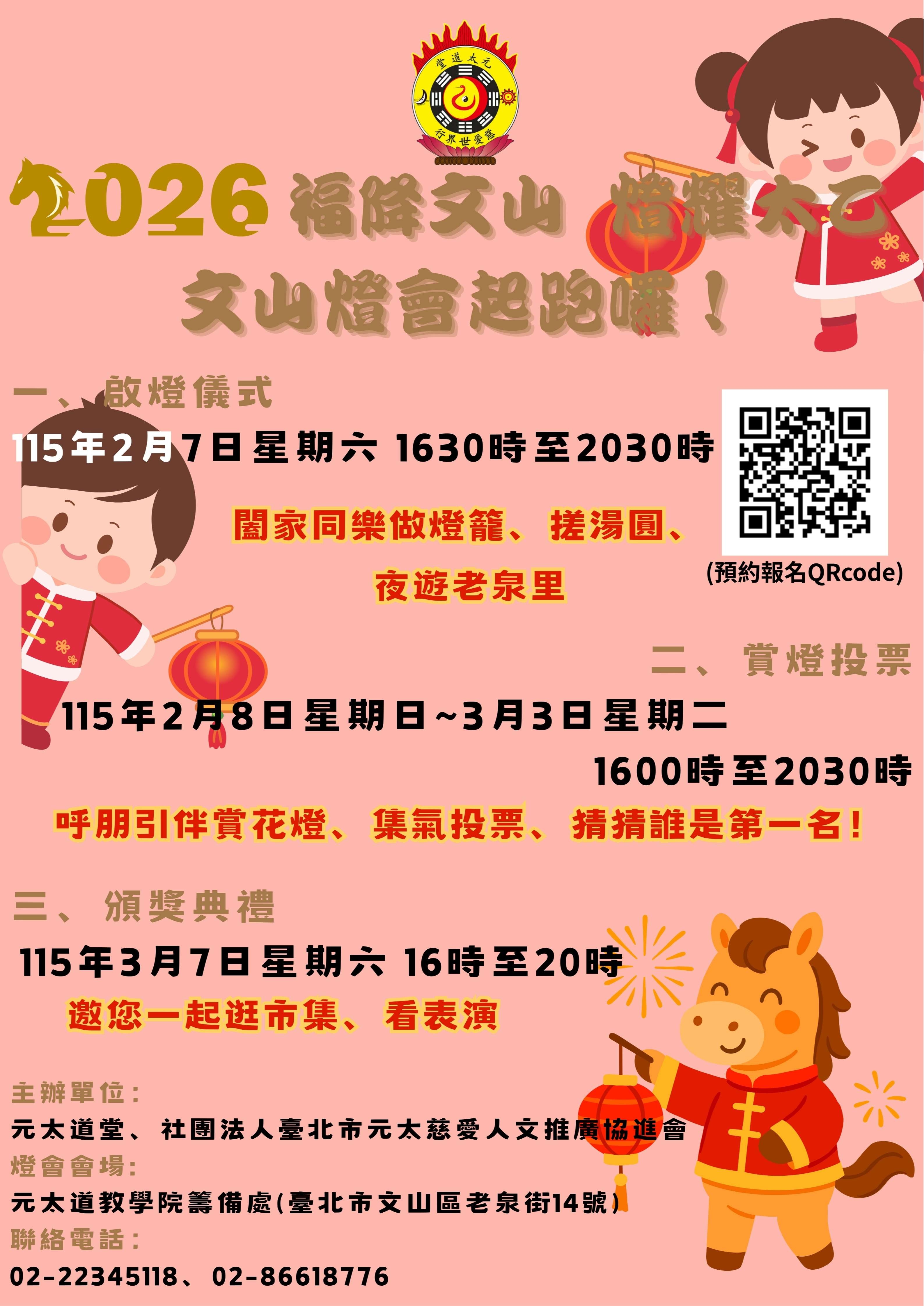 (一)點燈儀式:115年2月7日(星期六)下午4時至8時30分, 屆時將安排傳統元宵燈節活動:搓湯圓、做火把、做燈 籠。