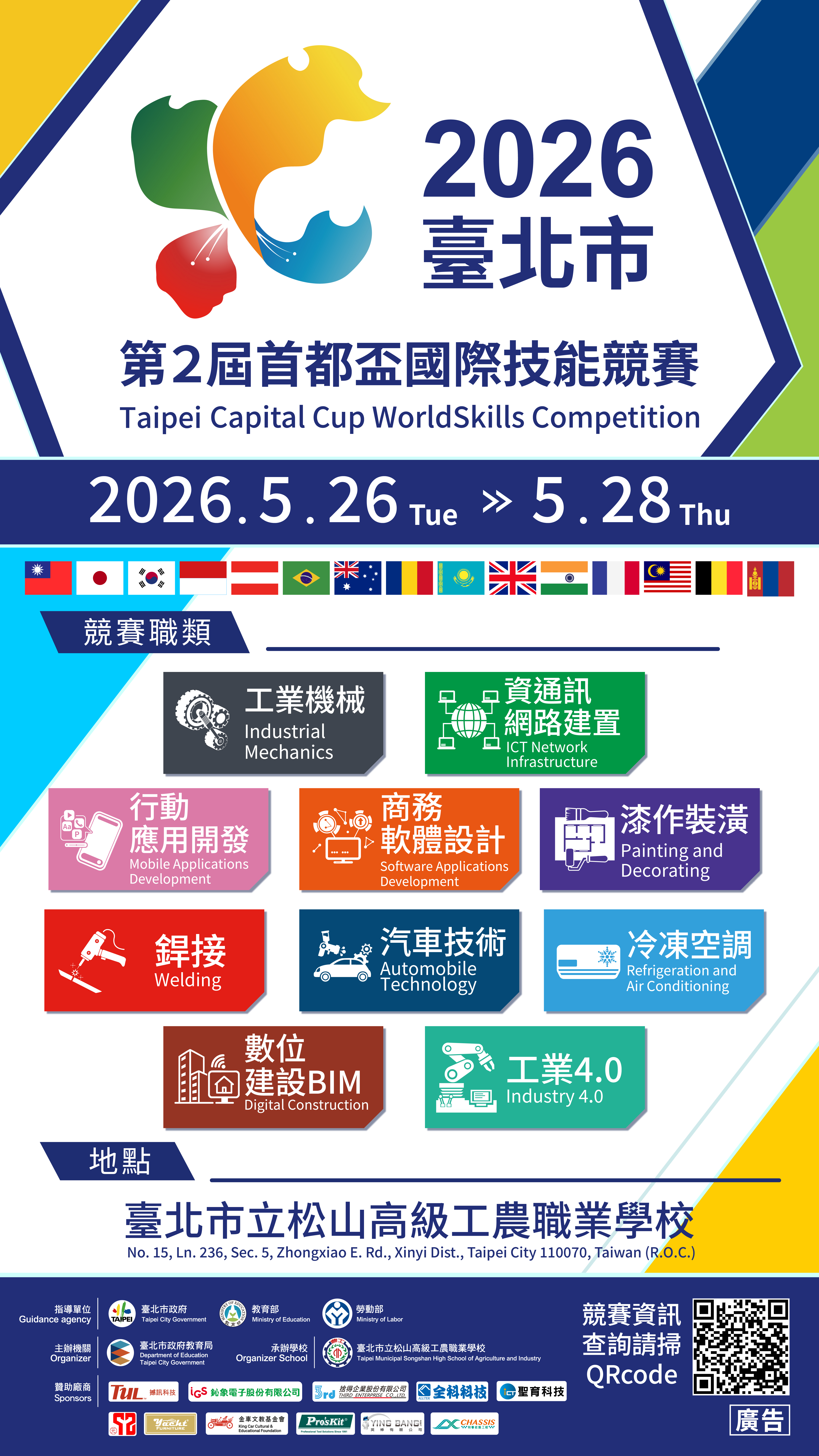二、本局為讓本國學生能與國際技藝選手相互交流切磋,於 2026年5月26日至28日辦理第2屆首都盃國際技能競賽,競 賽職類包含工業機械、資訊網路建置、行動應用開發、商 務軟體設計、銲接、漆作裝潢、汽車技術、冷凍空調、工 業4.0、數位建設BIM等10職類。
