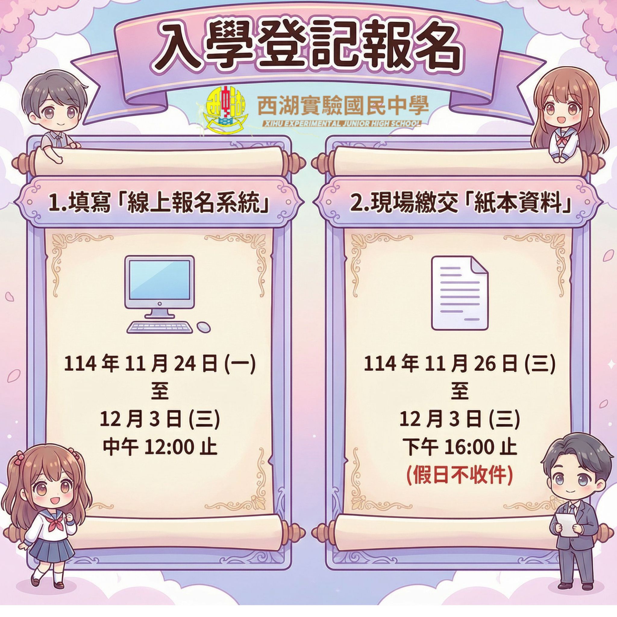 3. 報名資料請於上班時間 9:00 至 16: 00 繳交至1樓家長會辦公室(假日不收件)。資 料若缺漏將另行通知,並請於期限內補件。(必要條件) 4. 倘若家長本人未能依規定日期親自繳件報名,可填寫並繳交【臺北市西湖實驗國民中學 115 學年度新生入學委 託書】(附件四) 委託他人辦理。